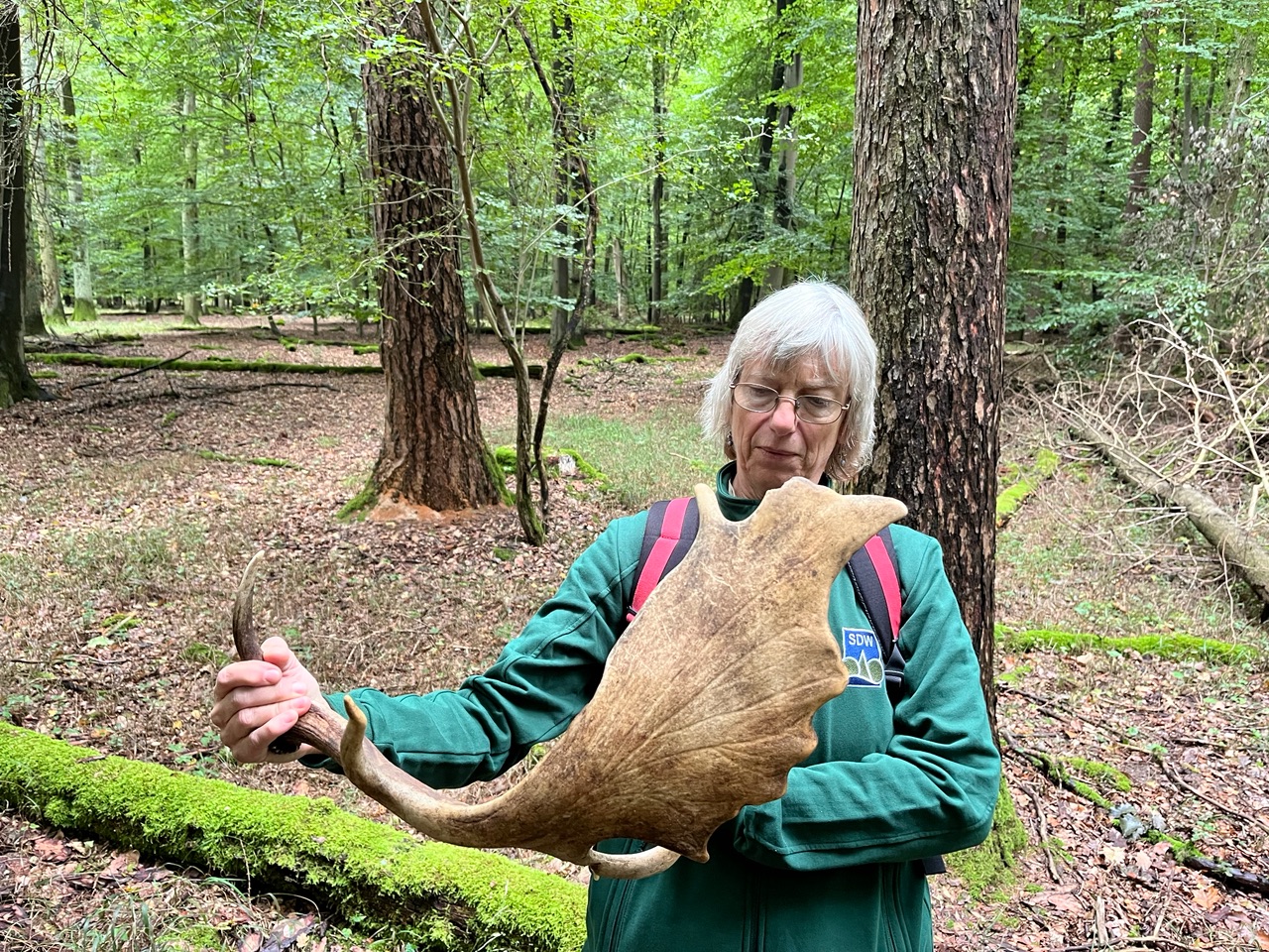 Einen Überaschungsfund gibt es auch: ein Rest einer Damwild Schaufel in einem Baumstamm.