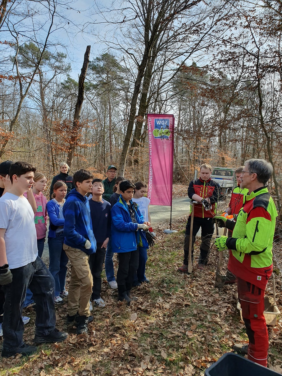 Die Abteilungsleiterin des StadtForstes, Frau Dr. Baumann, begrüßte die Schülerinnen und Schüler herzlich und freute sich sehr über das Engagement. „Wofür ist Wald denn wichtig?“, wollte sie von den Jugendlichen wissen. Und war begeistert über die vielen richtigen Antworten: „Er produziert unseren Sauerstoff,“ waren sich viele einig. Aber auch über Trinkwasser, Nahrung wie Pilze oder Beeren oder Lebensraum für Tiere und Pflanzen wussten sie viel zu berichten. Die Insektenwelt zu fördern, das ist eines der Ziele der Klasse an diesem Tag. Daher freuen sie sich, dass auch Sträucher gepflanzt werden. Auch wenn diese schon größer sind als die dünnen Flatterulmen und zum Teil auch pieksen. „Wir müssen zwar tiefer graben, aber dafür gibt es dann nachher schöne Blüten für die Schmetterlinge und das ist es wert“, sagte eine Schülerin schnaufend beim Ausheben eines tiefen Loches.