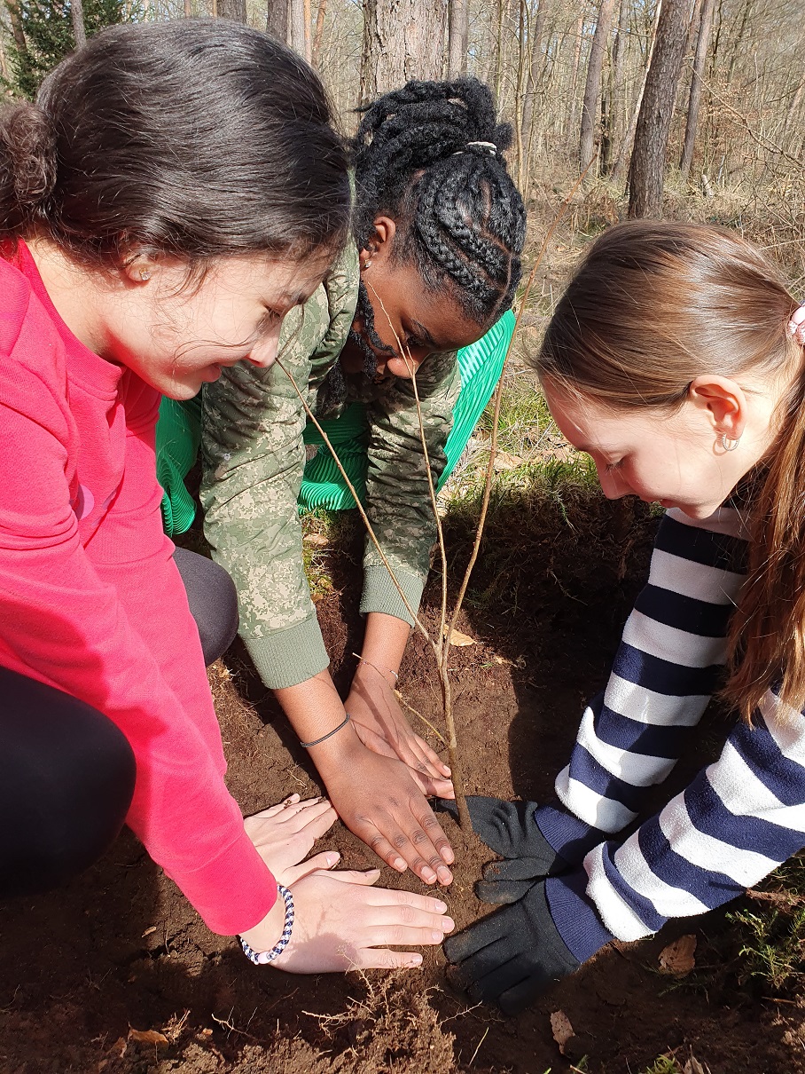 „Tag des Waldes“: Baumpflanzaktion der Schutzgemeinschaft Deutscher Wald mit einer Schulklasse in Zusammenarbeit mit dem StadtForst Frankfurt