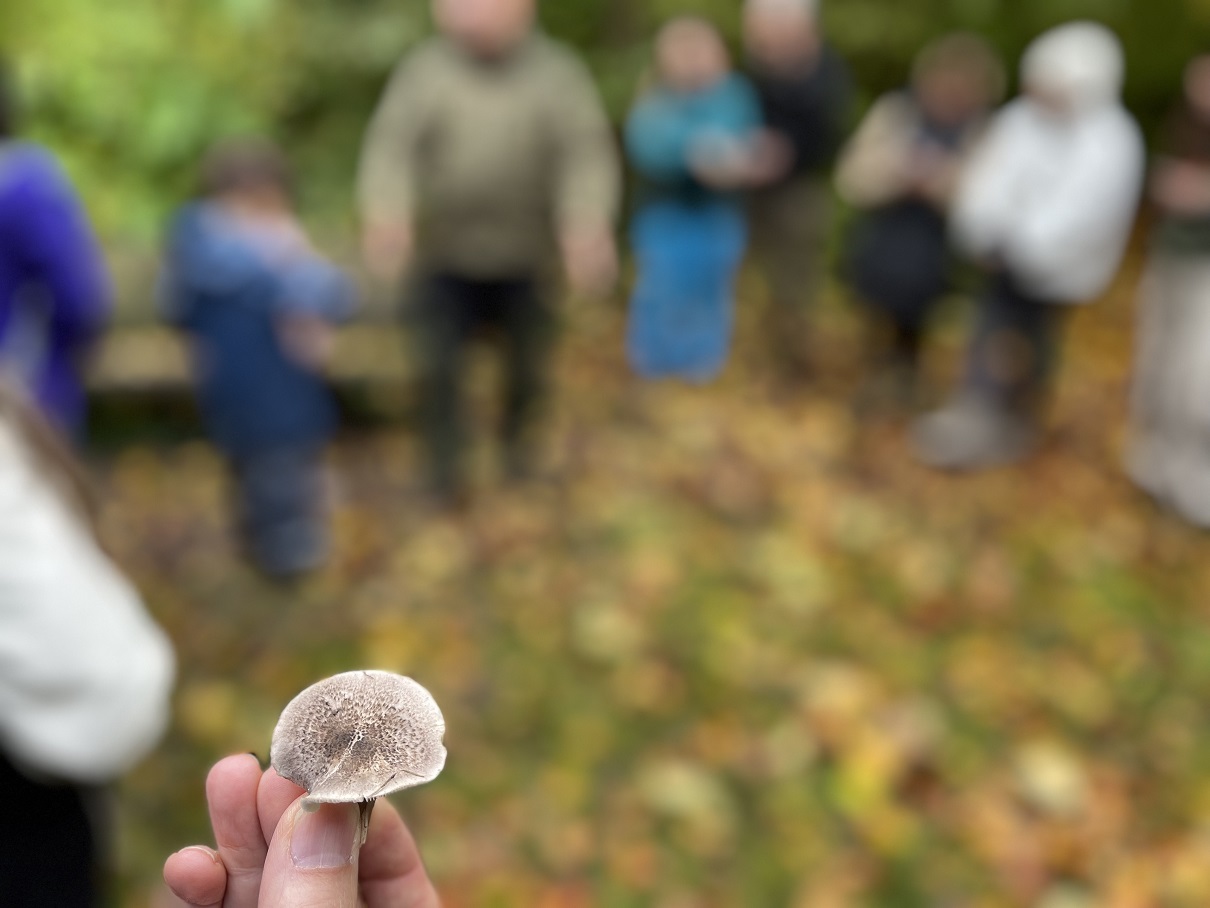 Mit einer Gruppe von ca. 20 Personen, diversen Körbchen, einem Hund und viel Neugier streiften wir durch das Unterholz in der Nähe der Forst- und Wanderwege. Jeder gefundene Pilz wurde exakt bestimmt und intensiv besprochen. Das "Ei" einer Stinkmorchel wurde zerlegt und das gesunde Innere verzehrt und die gallertartige Masse als Feuchtigkeitscreme eingesetzt.