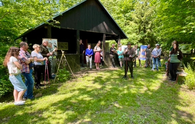 Wer hätte gedacht, dass wir uns schon zum 20. Mal zu einer Waldlesung treffen?“ fragte Förster Holger Scheel, als er die Gäste begrüßte. Dabei ist die Waldlesung bereits zu einer traditionellen Veranstaltung geworden. Das wissen auch die Gäste, die bereits fast eine Stunde vor Beginn der Waldlesung zu Fuß, mit Rad und Rollator zur Kobeltruhe strömten, wohlwissend, dass dort leckere Wildschinkenbrote auf sie warteten. Auch der Infostand der Schutzgemeinschaft Deutscher Wald war beliebt, denn dort gab es fachkundige Auskünfte rund um den Wald.