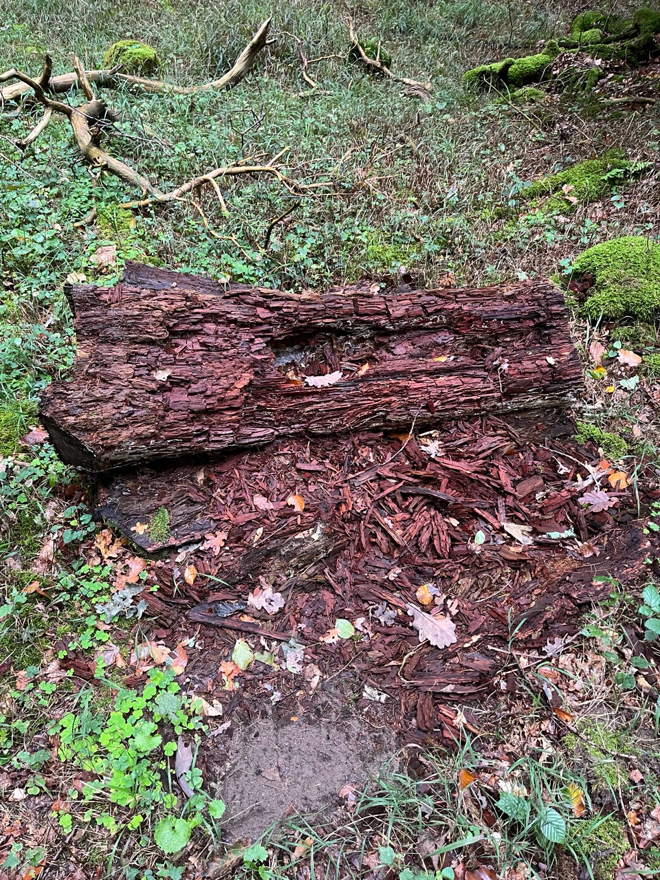 Einen Überaschungsfund gibt es auch: ein Rest einer Damwild Schaufel in einem Baumstamm.